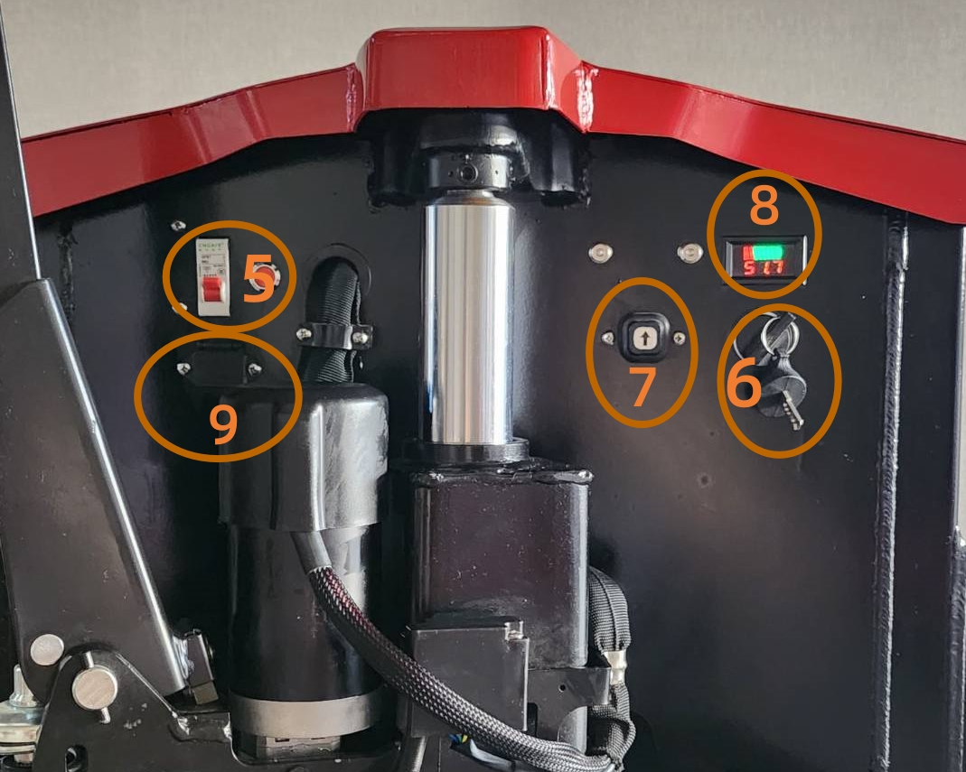 8.電量指示燈.如果到紅色格子請盡快充電.完全沒電.也不用擔心鎖死.(開機自動啟動煞車防滑功能.關機或沒電會關閉鎖死功能)可以用手動拉去充電。