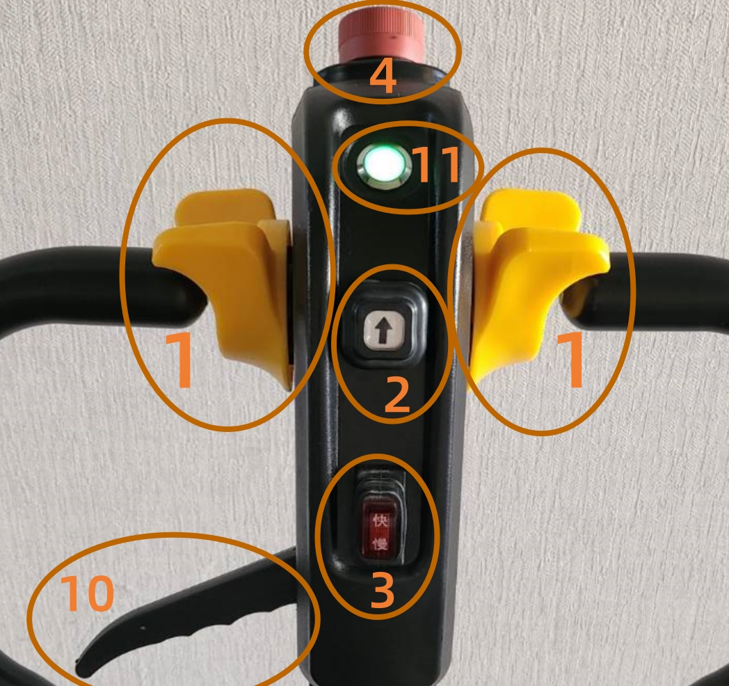 4.緊急防夾停止按鍵.碰到任何突發狀況.只要手掌輕輕按一下或是觸碰到身體.整車會斷電停止操作.如果狀況排除.向右旋轉彈起便可再繼續使用。