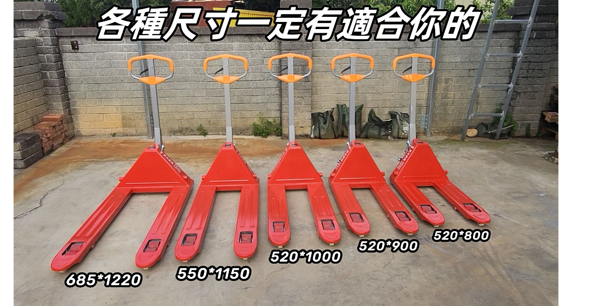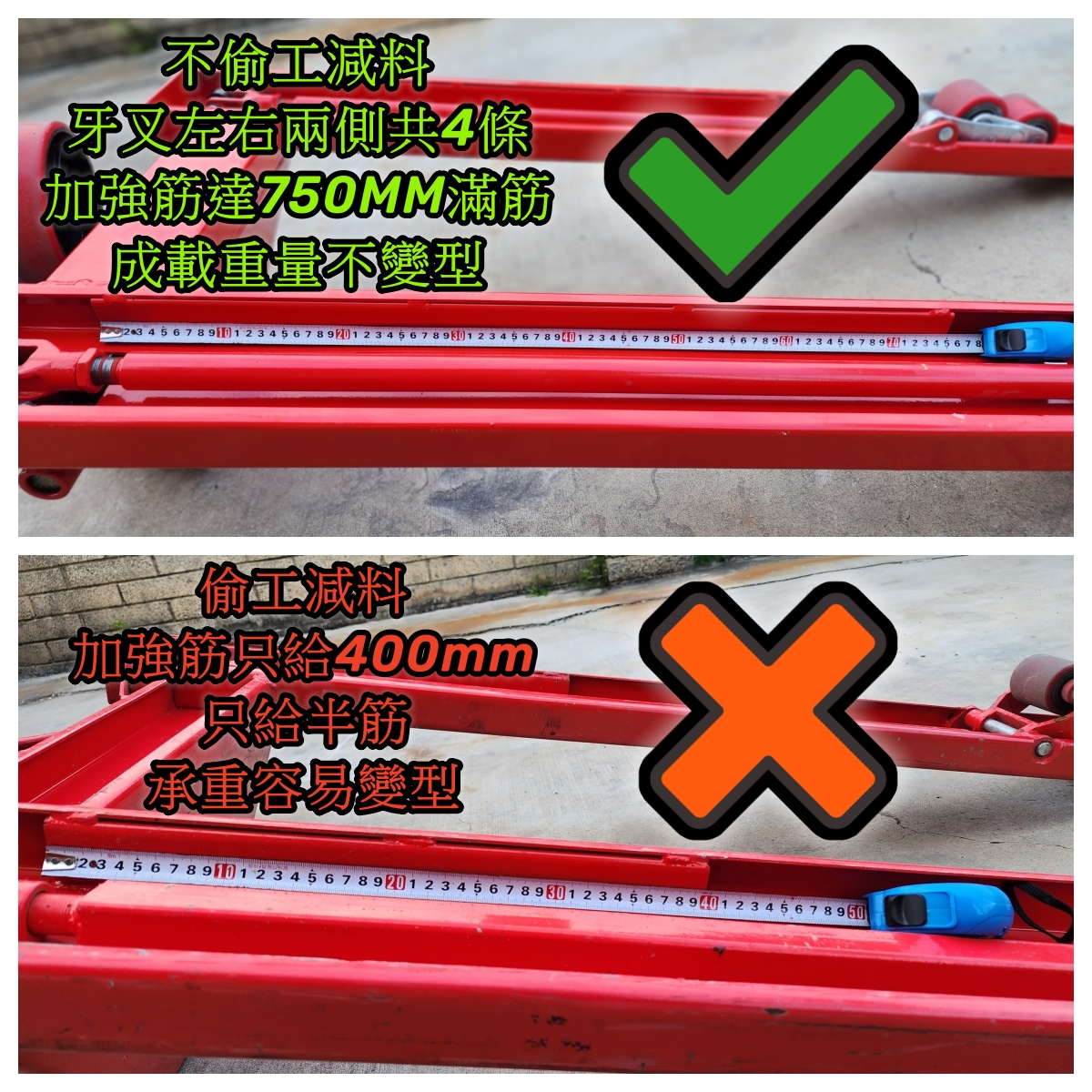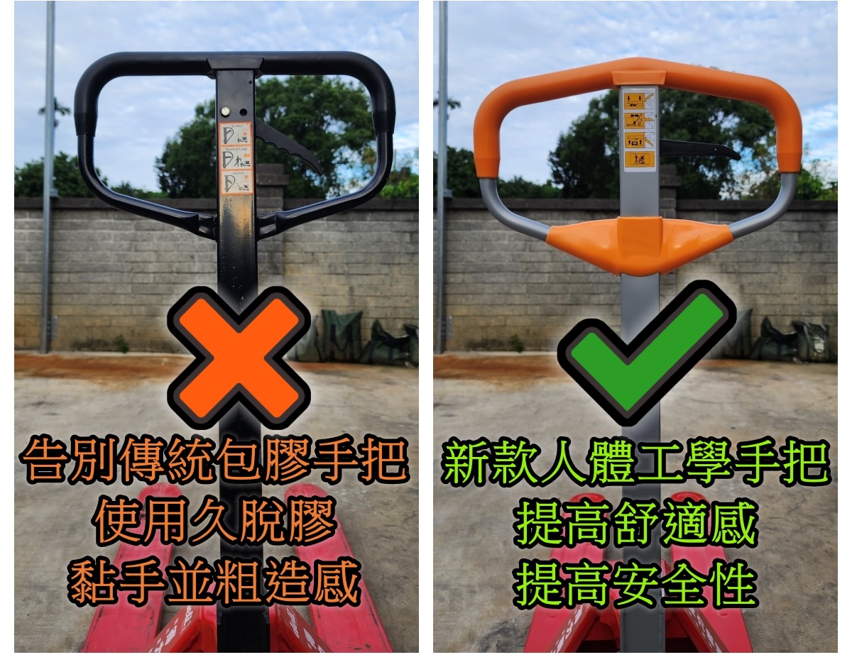 手把可控制重貨下降速度,可依作業環境輪子可選PU輪或尼龍輪, 提高作業安全性,貨叉連桿熱處理不易斷裂,牙叉雙邊補強不易變形,另可以依照客戶需求客製化